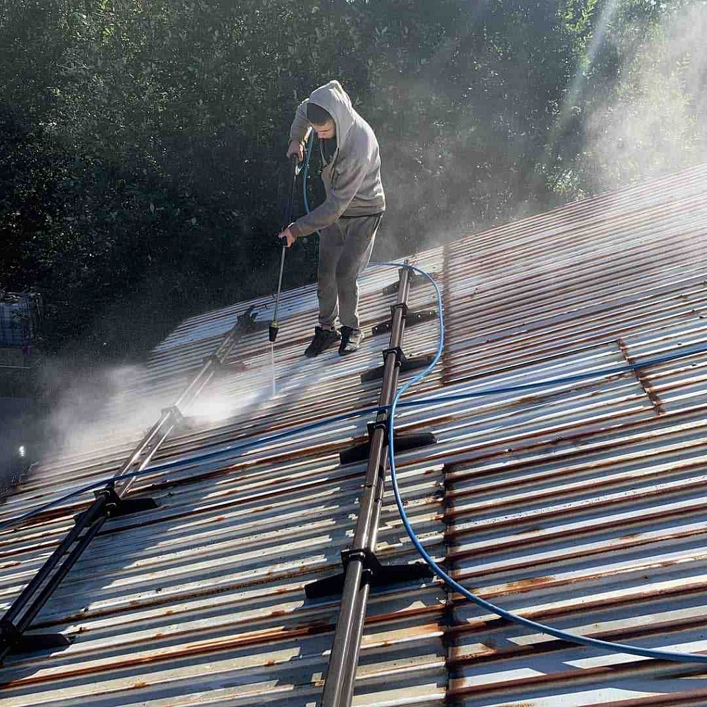 • Чистка крова от коррозии и отшелушивающегося слоя краски. Это будет следующим подготовительным шагом. После того, как крыша высохнет, наша команда производит зачистку от коррозии при помощи специальных щеток по металлу и болгарки (углошлифовальной машинки) с насадками для зачистки. Эта стадия обязательна в процессе покраски.
